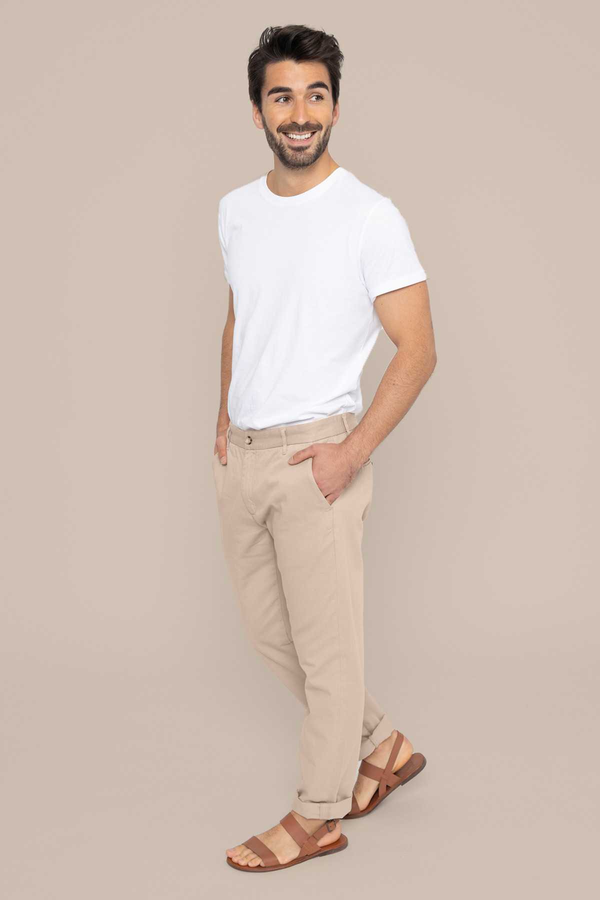 The Ross chino pants, a timeless summer wardrobe essential, can be worn with one or two cuffs for an even cooler and more casual look.