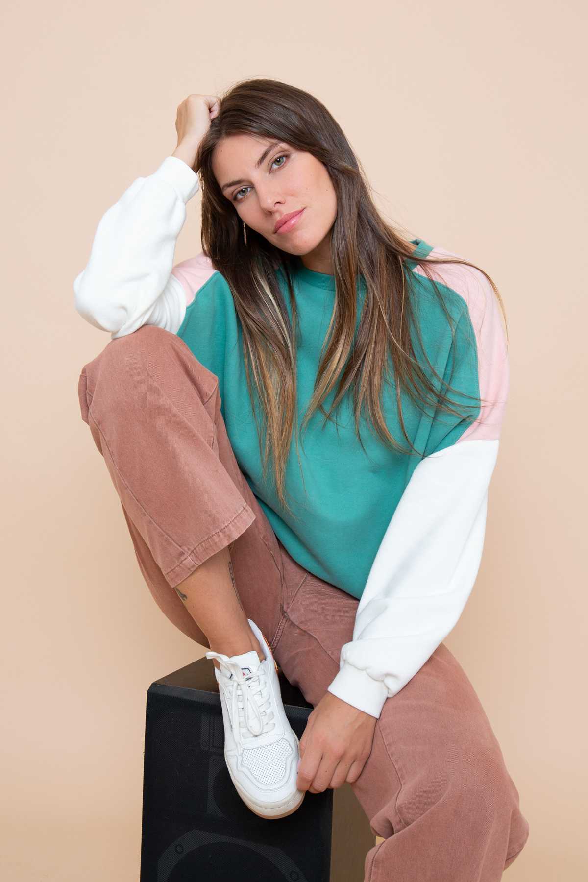 Discover our essential Cameron sweatshirt, with its oversized cut and relaxed look. Season after season, it has become a staple of the French Disorder wardrobe. Available with color block sleeves, it's the ideal piece to combine comfort and style.